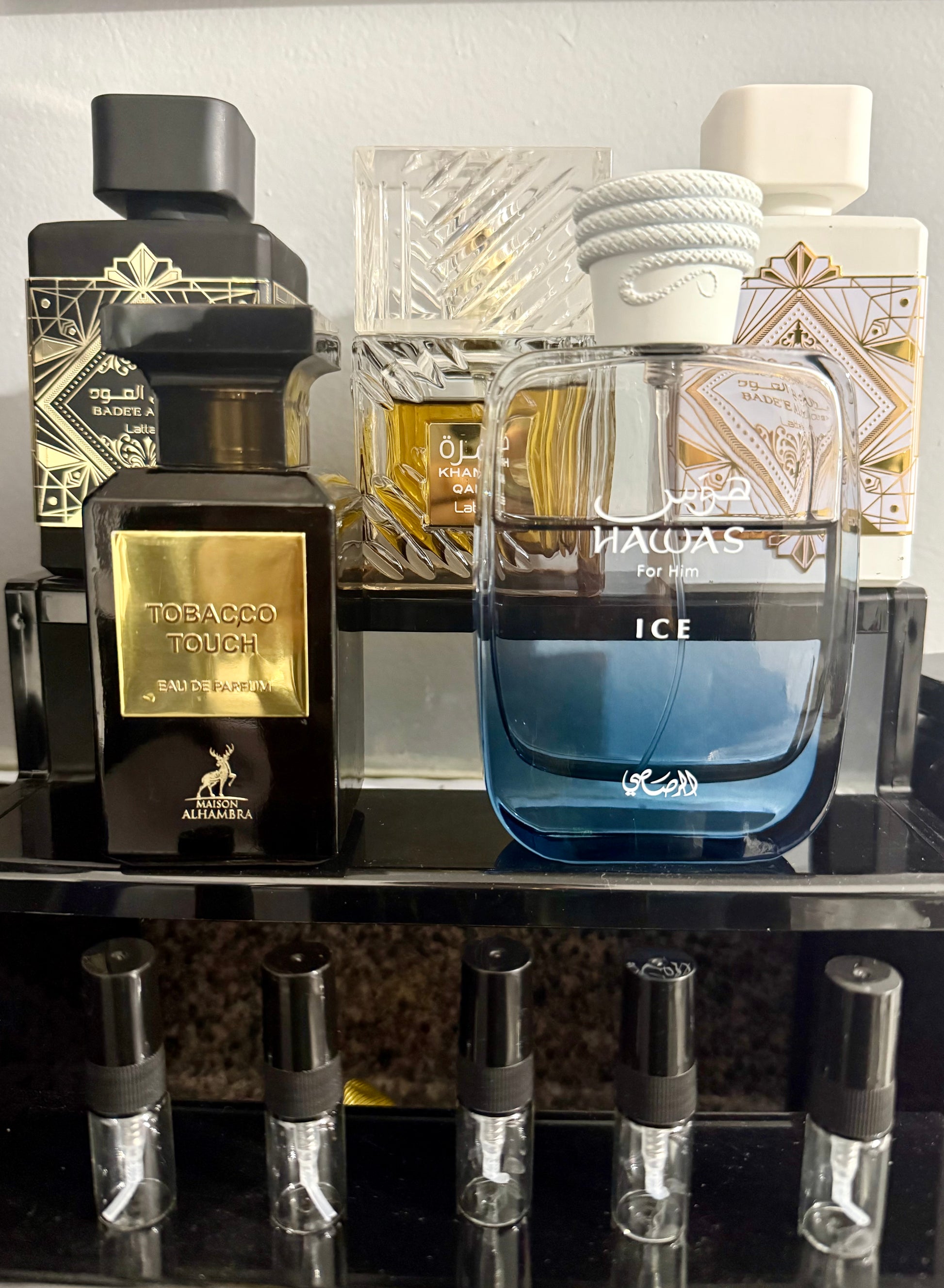 - Lattafa Oud For Glory, Lattafa Honor and Glory, Rasasi Hawas Ice, Madison Alhambra Tobbaco Touch, and Lattafa Khamrah Qahwa. 5 Individual Samples, available in 2 ML and 5 ML Sizes